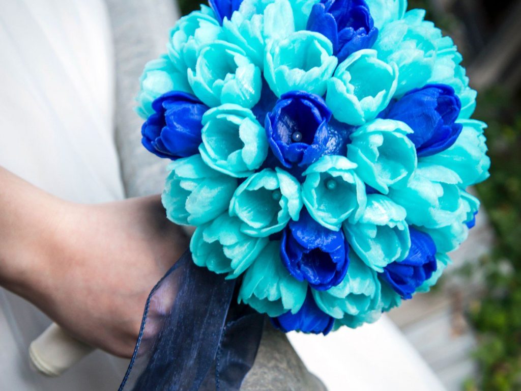 Das Projekt, das die meiste Zeit in Anspruch nahm, waren die Sträuße. Alle, rund 200 Blumen aus leuchtend blauem Filament, hat Erin einzeln mit ihren beiden Druckern gefertigt. Insgesamt hat sie über viele Monate hinweg mehr als 100 Stunden damit verbracht Blumen zu drucken. Wann immer sie konnte, sei es nach der Arbeit oder am Wochenende, schmiss sie die Drucker an. Die fertigen Tulpen arrangierte sie dann auf Styroporkugeln mit traditionellen, floralen Arrangementstiften und Klebstoff.